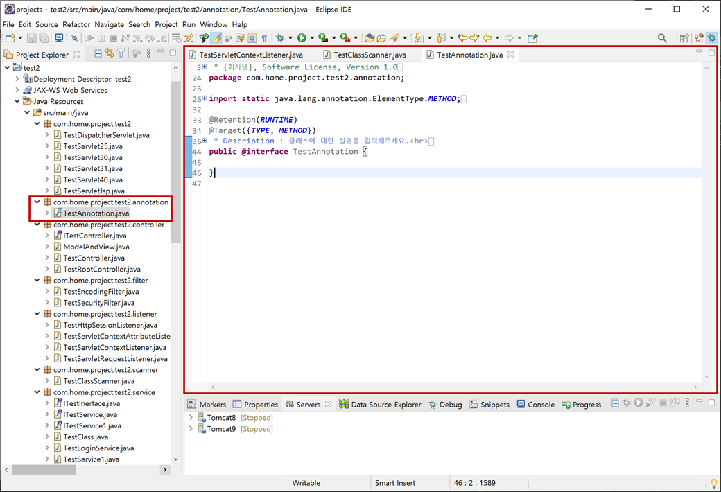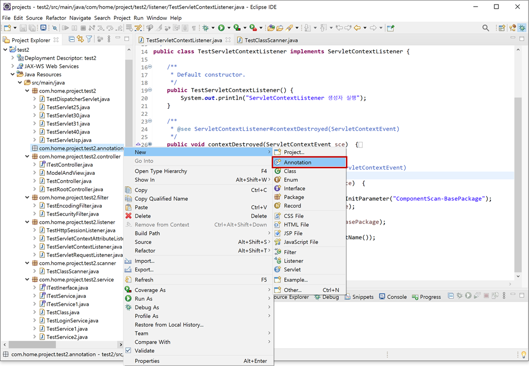 1. "test2" 프로젝트의 "Java Resources"에서 "src/main/java"의 "com.home.project.test2"를 선택한 후 오른쪽 버튼을 클릭하여 컨텍스트 메뉴 [New > Package]를 클릭하여 "Name"의 기존 패키지명에 ".annotation"를 추가하고 "Finish"버튼을 클릭합니다. 추가된 "com.hom.project.test2.annotation"에서 오른쪽 버튼을 클릭하여 컨텍스트 메뉴 [New > Annotation]를 클릭합니다.