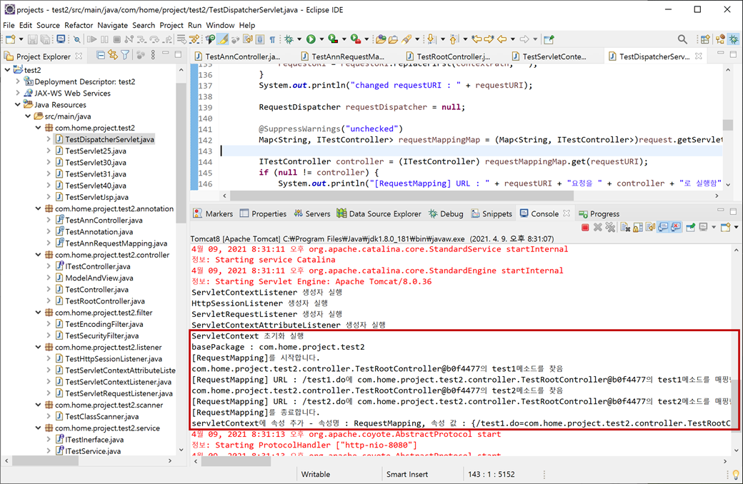 "TestDispatcherServlet.java"의 "service"메소드에서 서블릿 콘텍스트(ServletContext)에 추가된 "RequestMapping"를 가져옵니다.