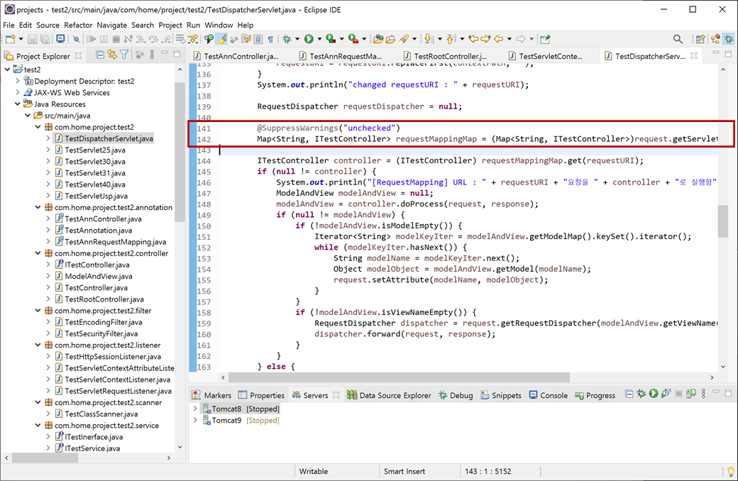 @SuppressWarnings("unchecked")를 추가한 이유는 "Type safety: Unchecked cast from Object to Map<String, ITestController>"로 객체를 확인되지 않은 유형(Map<String, ITestController>)으로 형 변환에 한 것에 대한 안정성 경고를 무시하기 위해서 입니다.