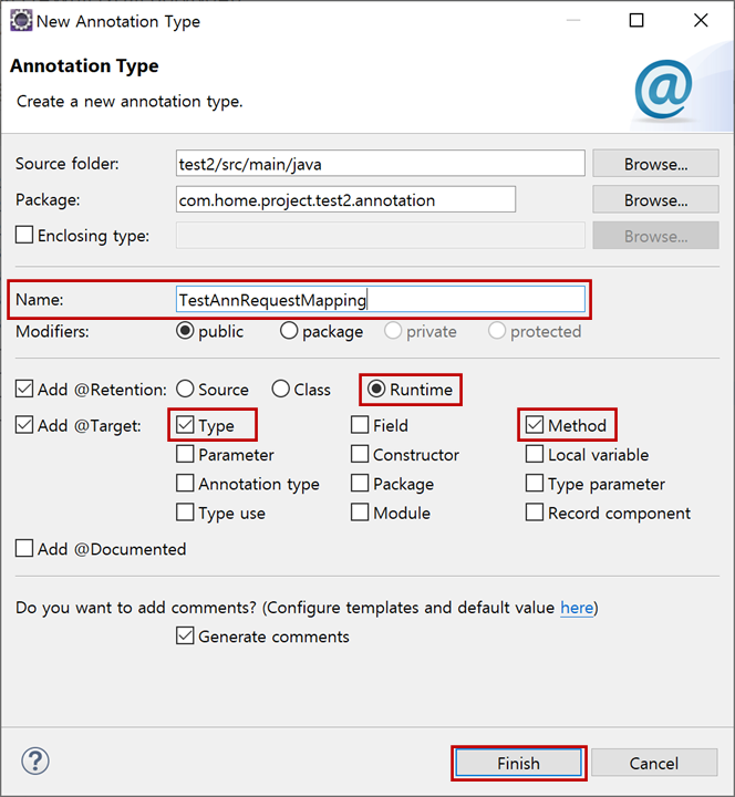 "New Annotation Type"창에서 "Name"에 "TestAnnRequestMapping"를 입력하고 "@Retention"은 "Runtime", "@Target"은 "Type"과 "Method"를 선택하고 "Finish"버튼을 클릭합니다.