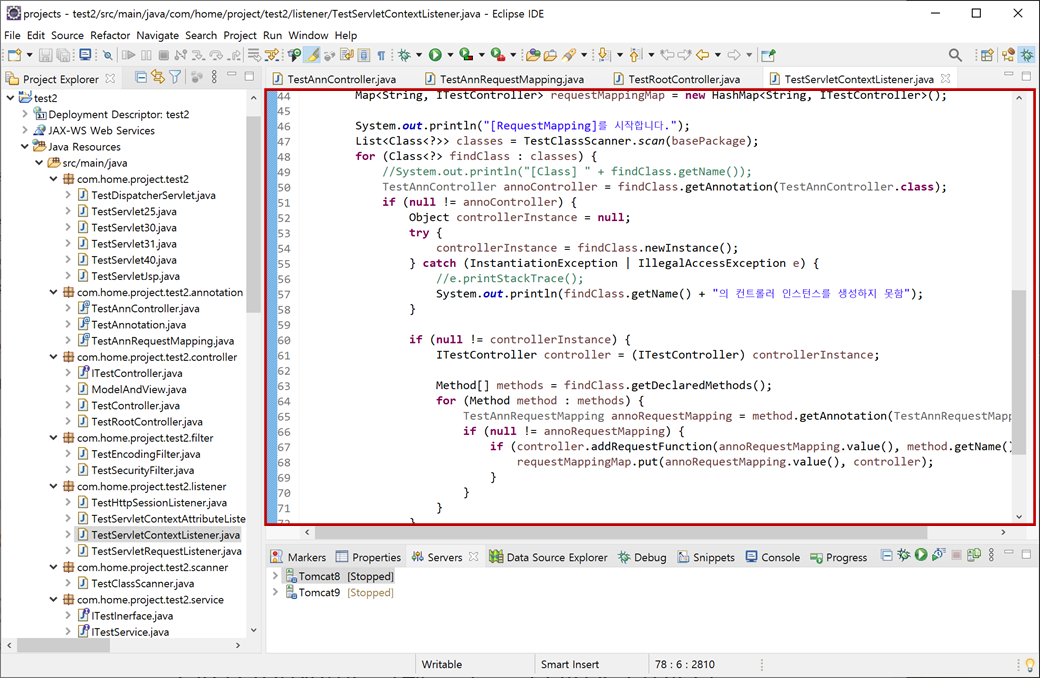 4. "TestServletContextListener.java"에 요청매핑맵(Request Mapping Map)을 추가합니다.