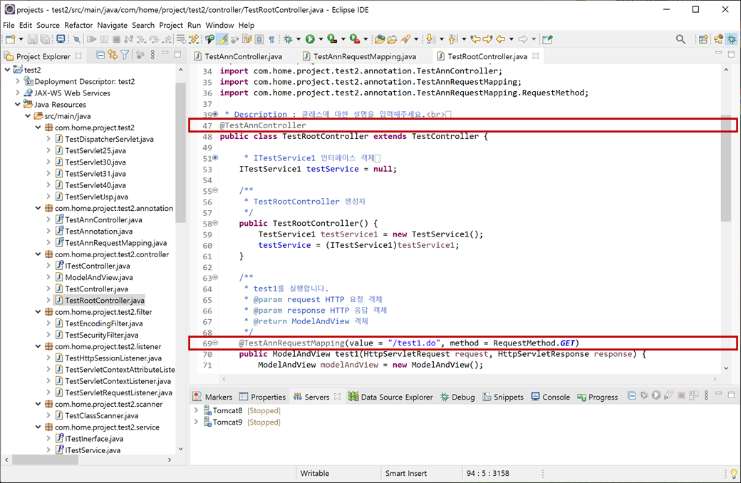 3. "TestRootController.java"의 클래스 위에 "@TestAnnController"어노테이션(Annotation)를 추가합니다.