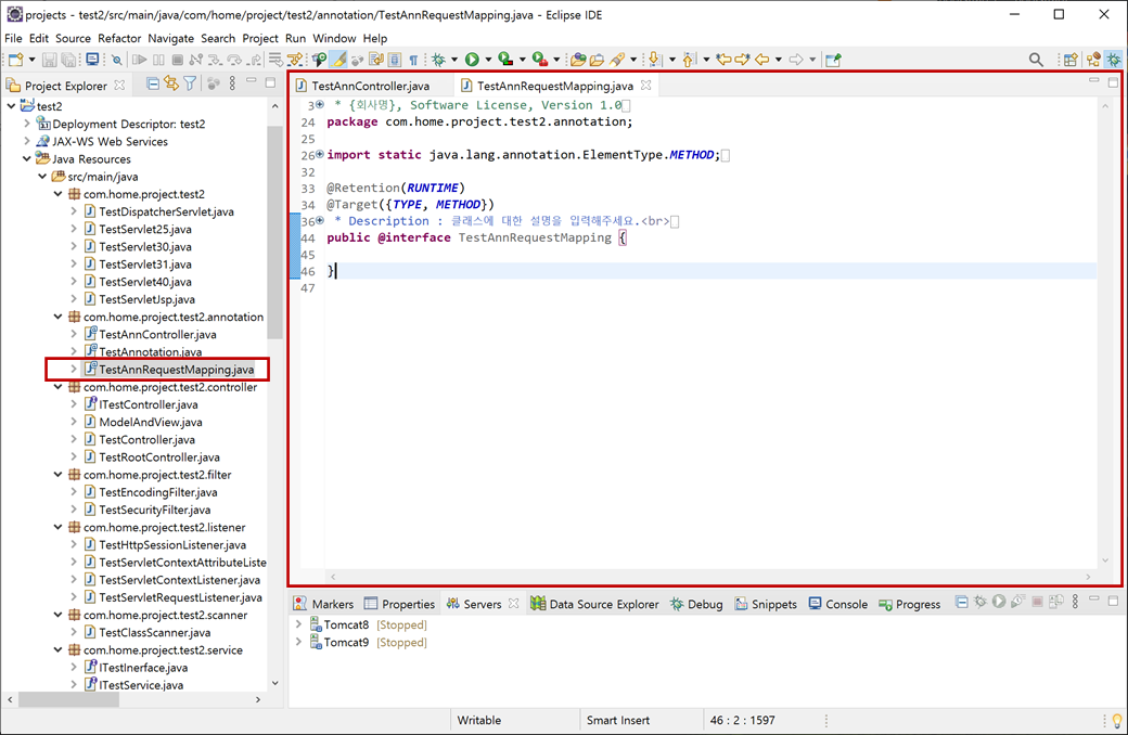 1. "test2" 프로젝트의 "Java Resources"에서 "src/main/java"의 "com.hom.project.test2.annotation"에서 오른쪽 버튼을 클릭하여 컨텍스트 메뉴 [New > Annotation]를 클릭합니다.