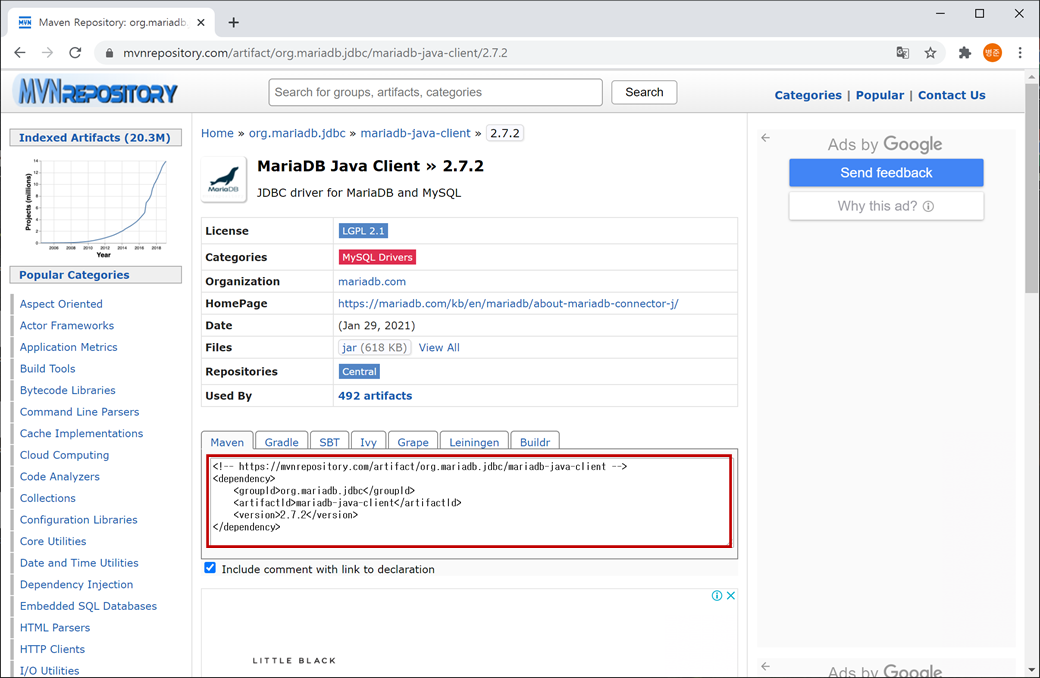 "JDBC driver for MariaDB and MySQL"인 "MariaDB Java Client"를 클릭합니다.