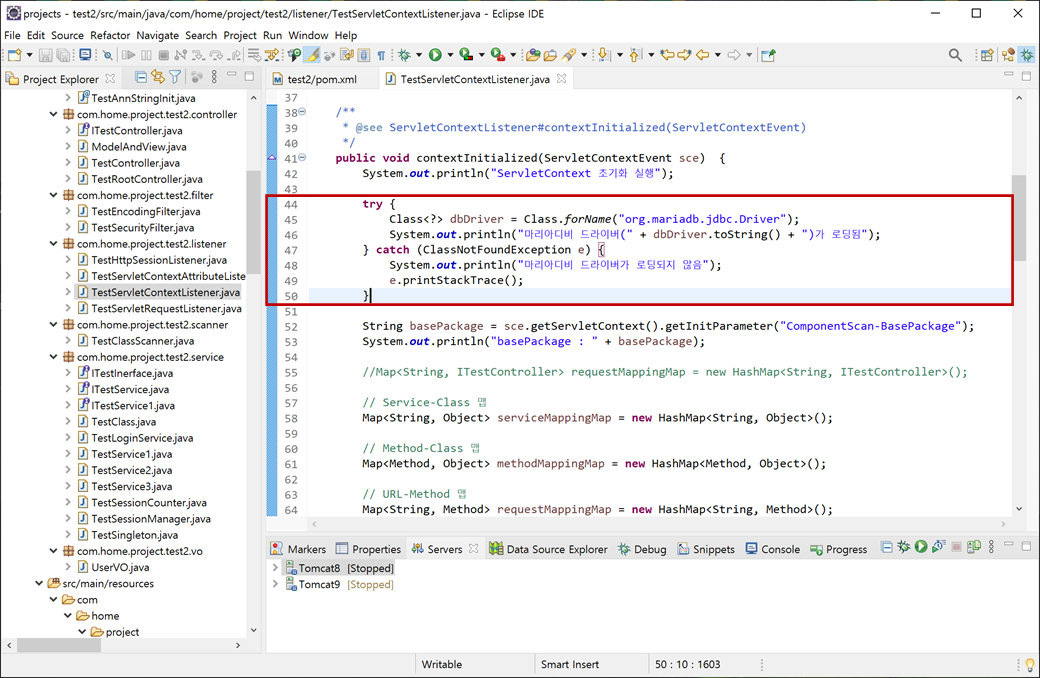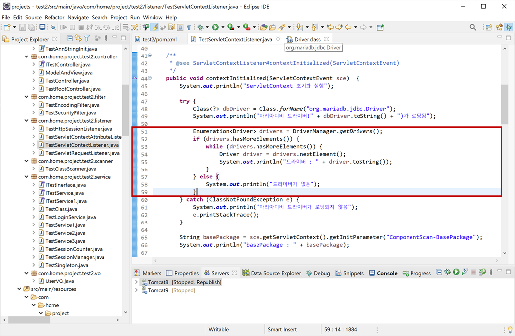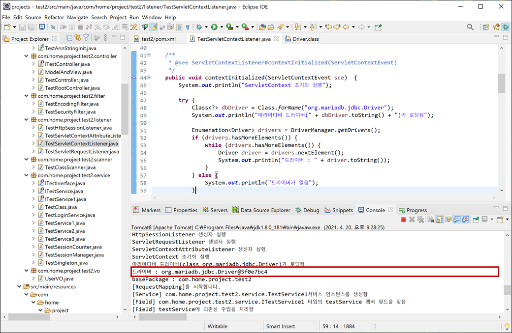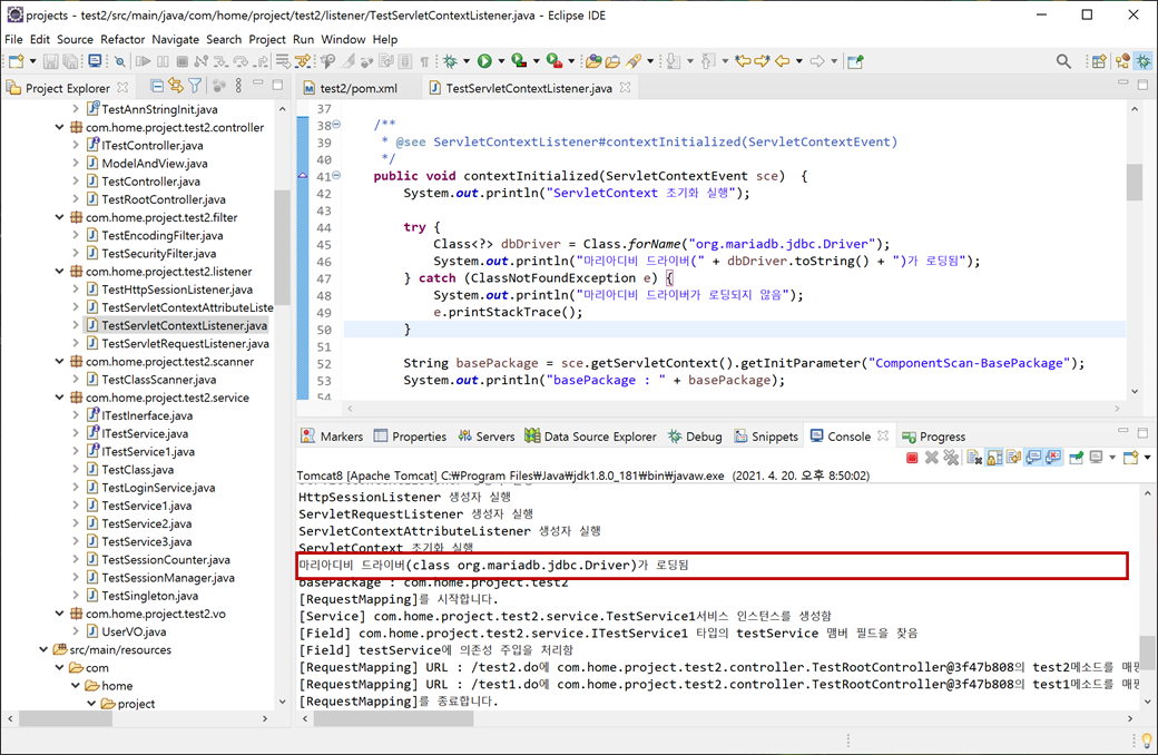 3. "TestServletContextListener.java"의 "contextInitialized"에서 마리아디비(MariaDB)와 연결하기 위해 JDBC 드라이버(driver)를 로딩하겠습니다. "ServletContextListener"에서 하는 이유는 디비를 먼저 로딩하여 다오(dao) 클래스에서 사용할 수 있게 의존성 주입(Dependency Injection - DI)하기 위해서 입니다.