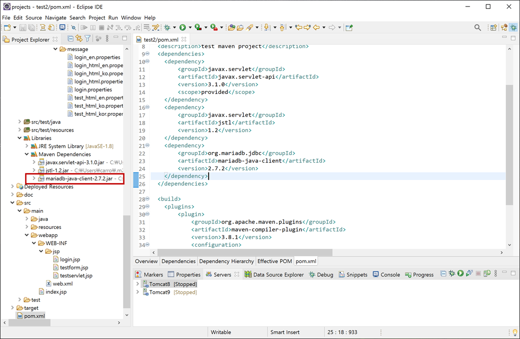 2. "test2" 프로젝트의 "pom.xml"을 오픈하여 붙여넣기하고 저장합니다. 그러면 Maven에서 "mariadb-java-client-2.7.2.jar"파일들을 자동으로 다운로드 받습니다.