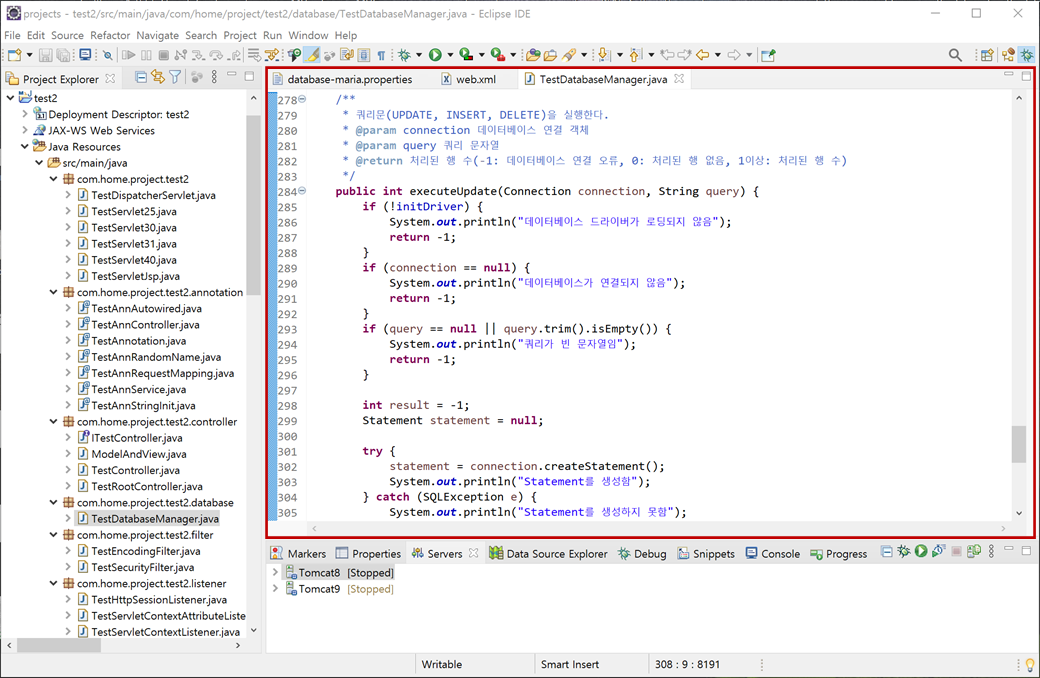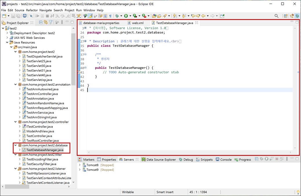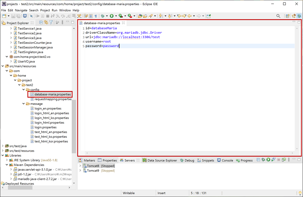 1. "test2" 프로젝트의 "Java Resources"에 "src/main/resources"에서 "/com/home/project/test2/config"에 있는 "database-maria.properties"파일을 생성합니다.