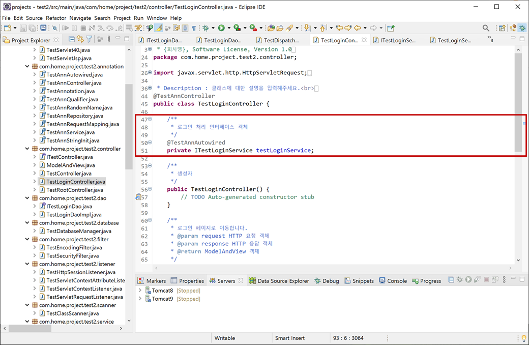 "TestLoginController.java"클래스에 "ITestLoginService"클래스 맴버 필드를 추가하고 "@TestAnnAutowired"어노테이션을 추가합니다.