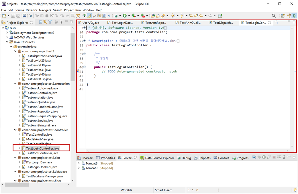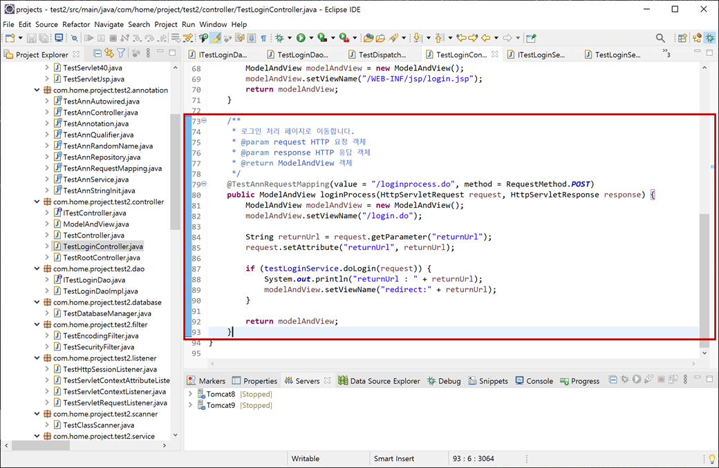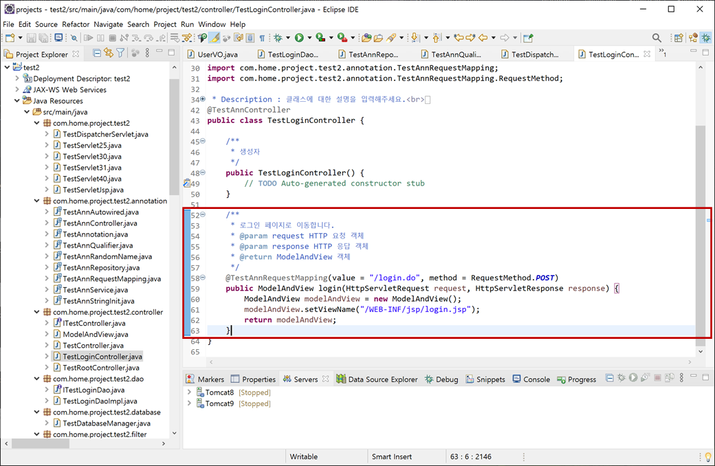 기존 "TestDispatcherServlet.java"의 "service"메소드에서 처리되는 "login.do"과 "loginprocess.do"를 로그인 컨트롤러(Controller)를 만들어 분리하겠습니다.