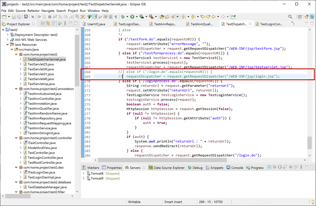 기존 "TestDispatcherServlet.java"의 "service"메소드에서 처리되는 "loginprocess.do"부분은 주석처리하거나 삭제합니다.