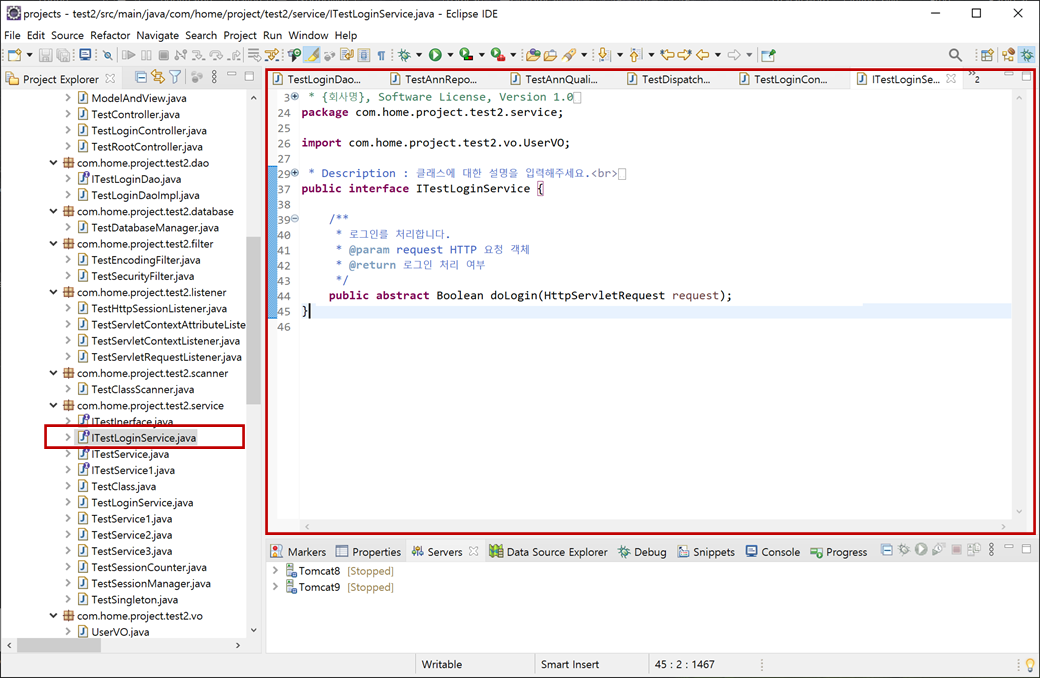 "TestLoginService.java"에 기존 "process"메소드를 수정하여 "ITestLoginService.java"의 "doLogin"메소드를 구현합니다.