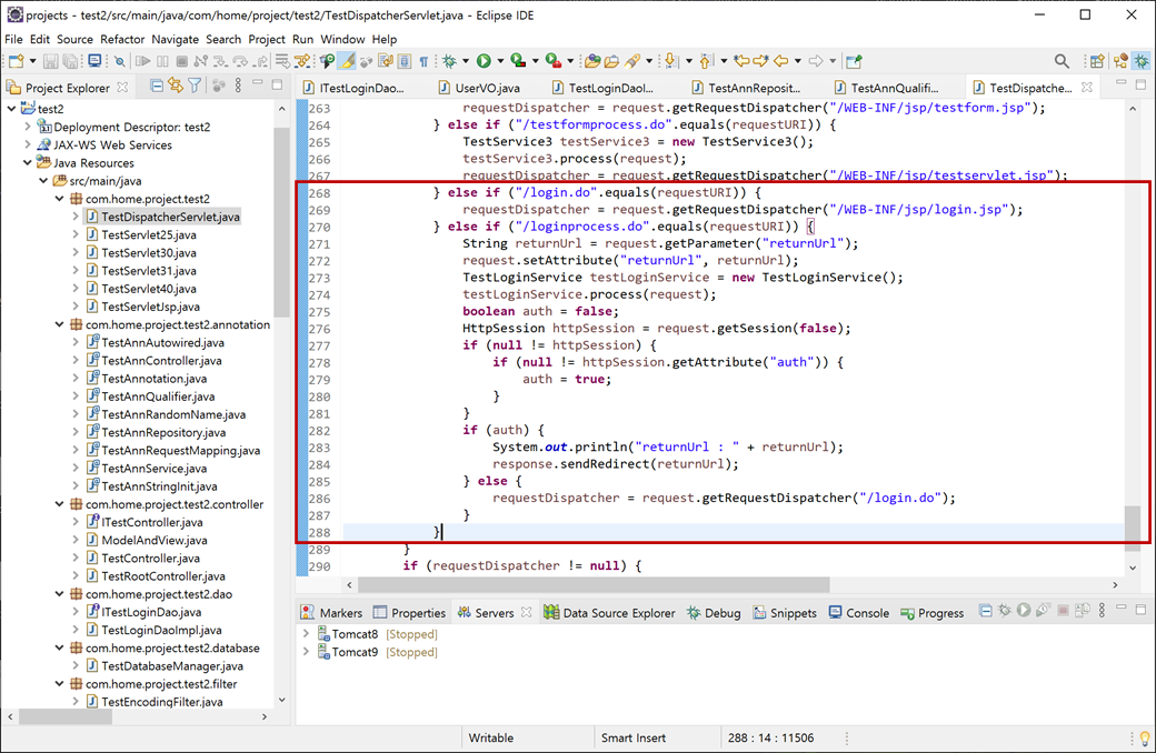 10. 기존 "TestDispatcherServlet.java"의 "service"메소드에서 처리되는 "loginprocess.do"입니다.
