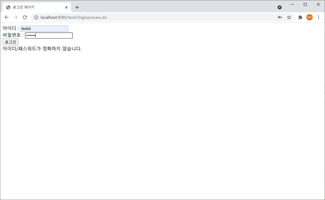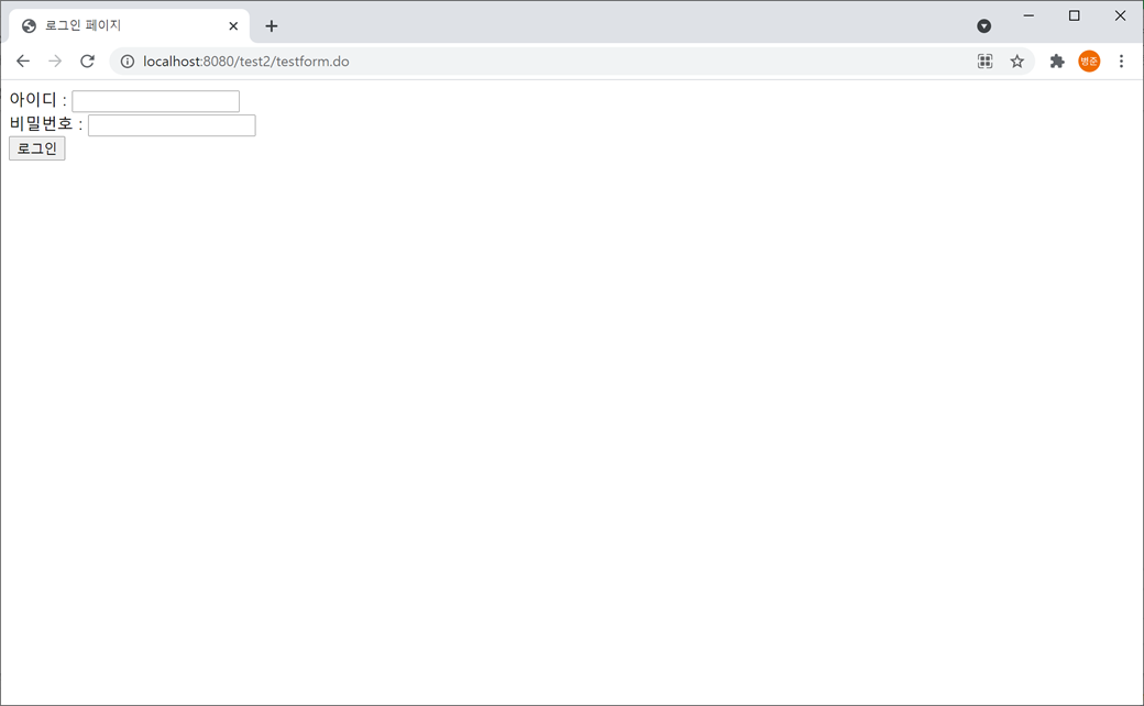 웹 브라우저에서 "http://localhost:8080/test2/testform.do"를 입력합니다.