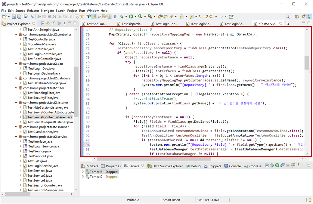 12. "TestServletContextListener.java"의 "contextInitialized"에 서비스(Service) 클래스에서 선언된 맴버 필드 리스트를 가져와서 "@TestAnnAutowired"어노테이션이 있는 DAO 인터페이스 필드에 주입(인젝션)하는 부분을 추가합니다.