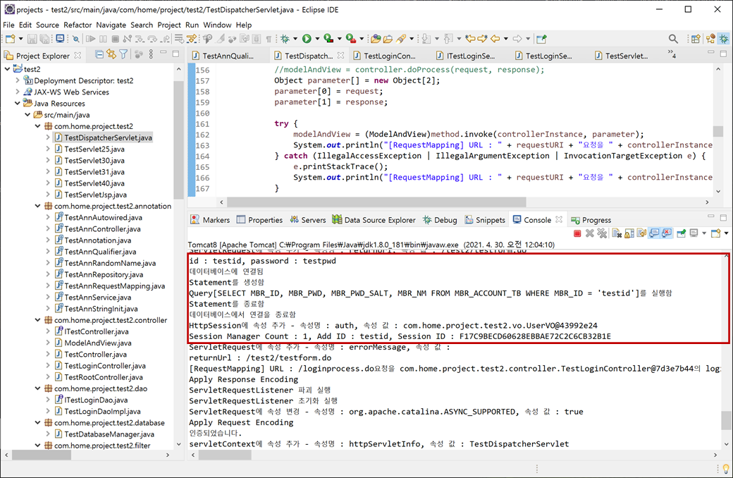HttpSession에 속성 추가 - 속성명 : auth, 속성 값 : com.home.project.test2.vo.UserVO@43992e24