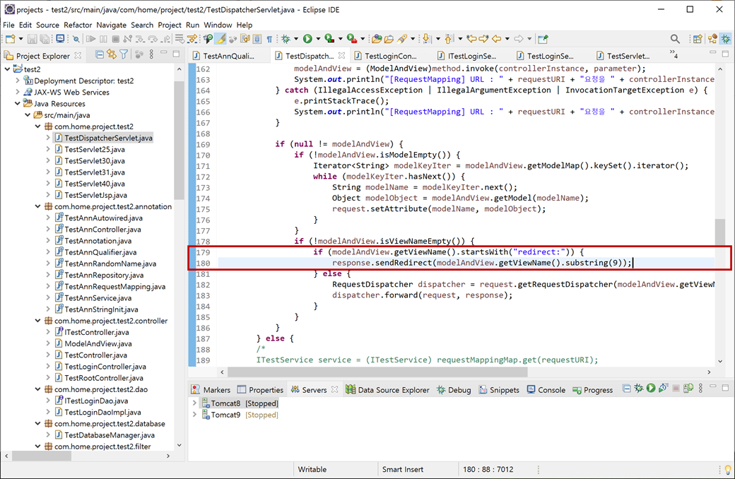 13. "TestDispatcherServlet.java"의 "service"메소드에 "redirect"를 처리하기 위해 "response"의 "sendRedirect"메소드를 추가합니다.