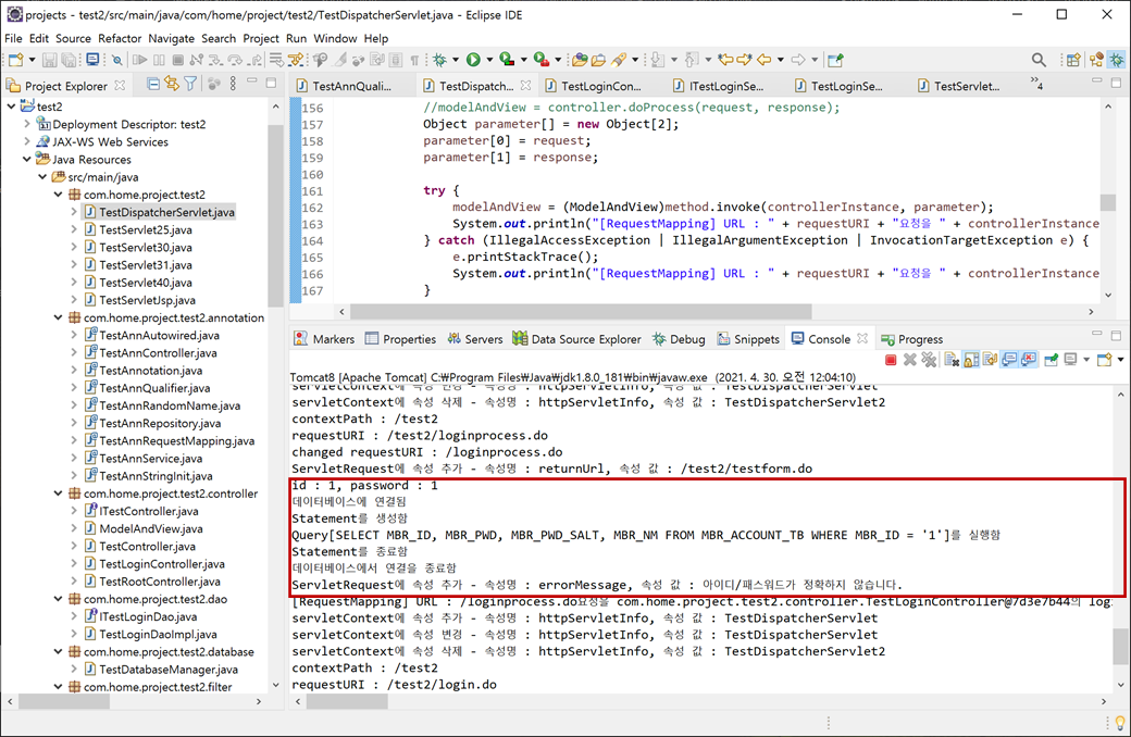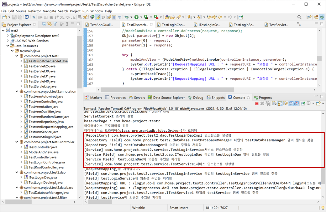 [Service Field] com.home.project.test2.dao.ITestLoginDao 타입의 testLoginDao 맴버 필드을 찾음