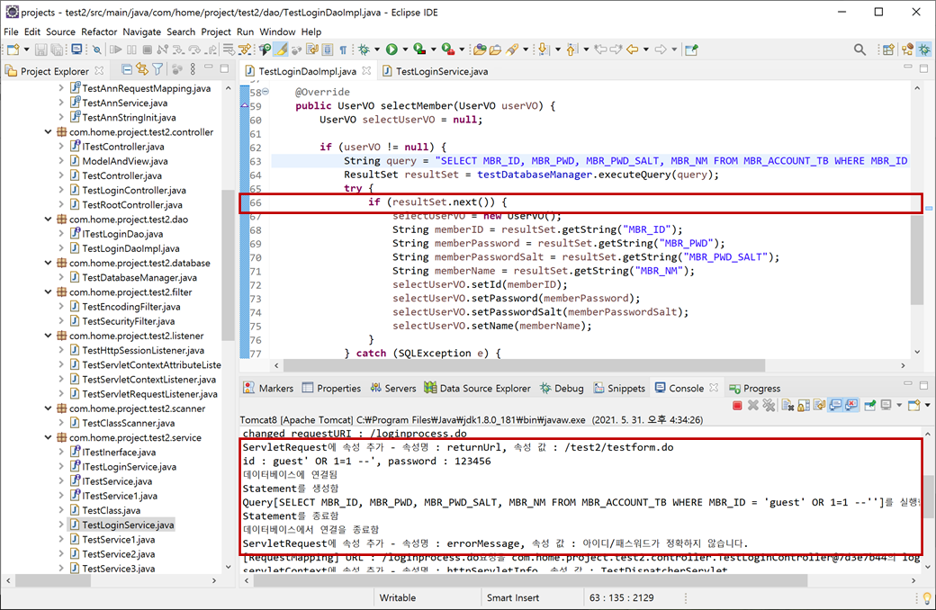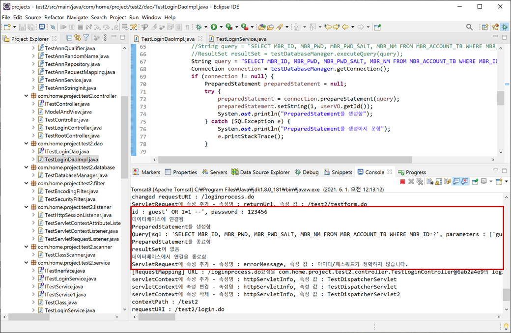 실제로 "SQL Injection"를 테스트 해보고 안정적인 코딩을 위해 "PreparedStatement"를 이용하여 쿼리(query)문을 실행 할 수 있게 하겠습니다.