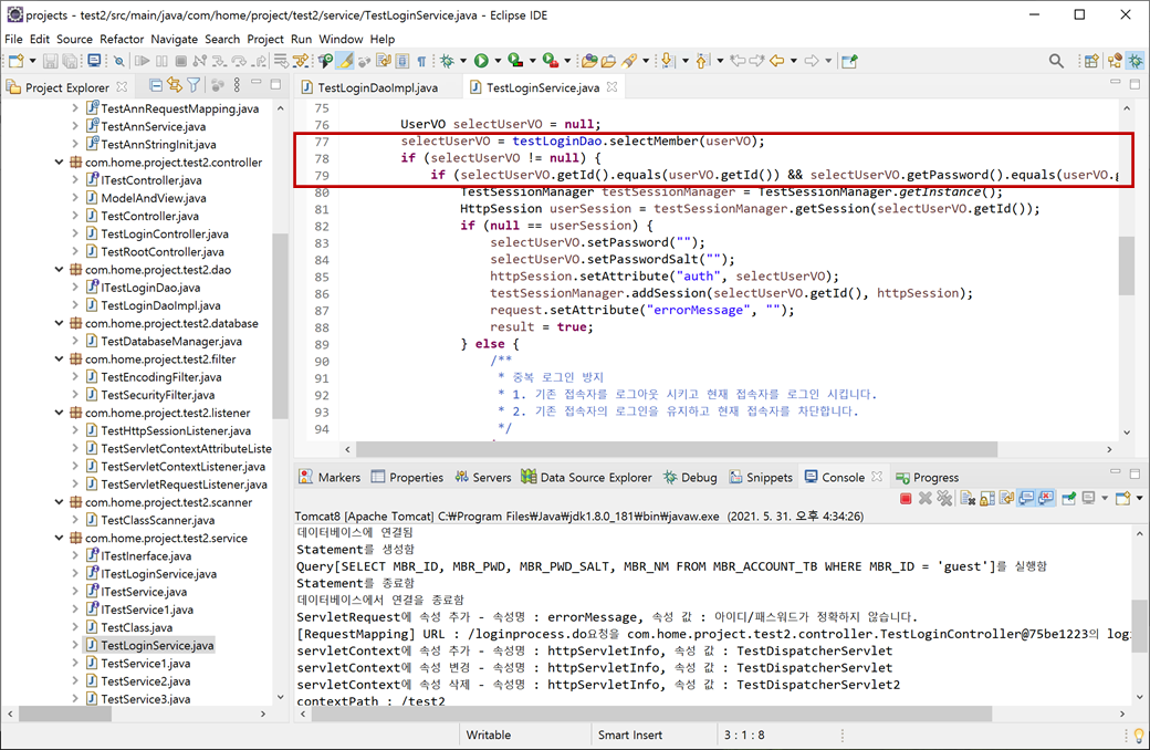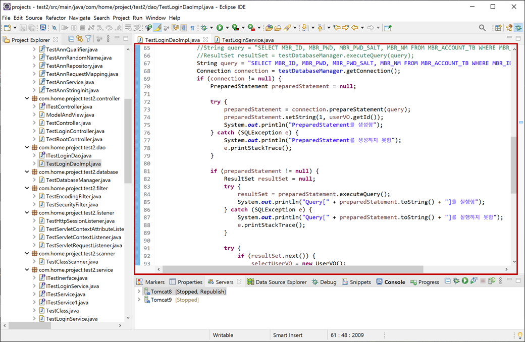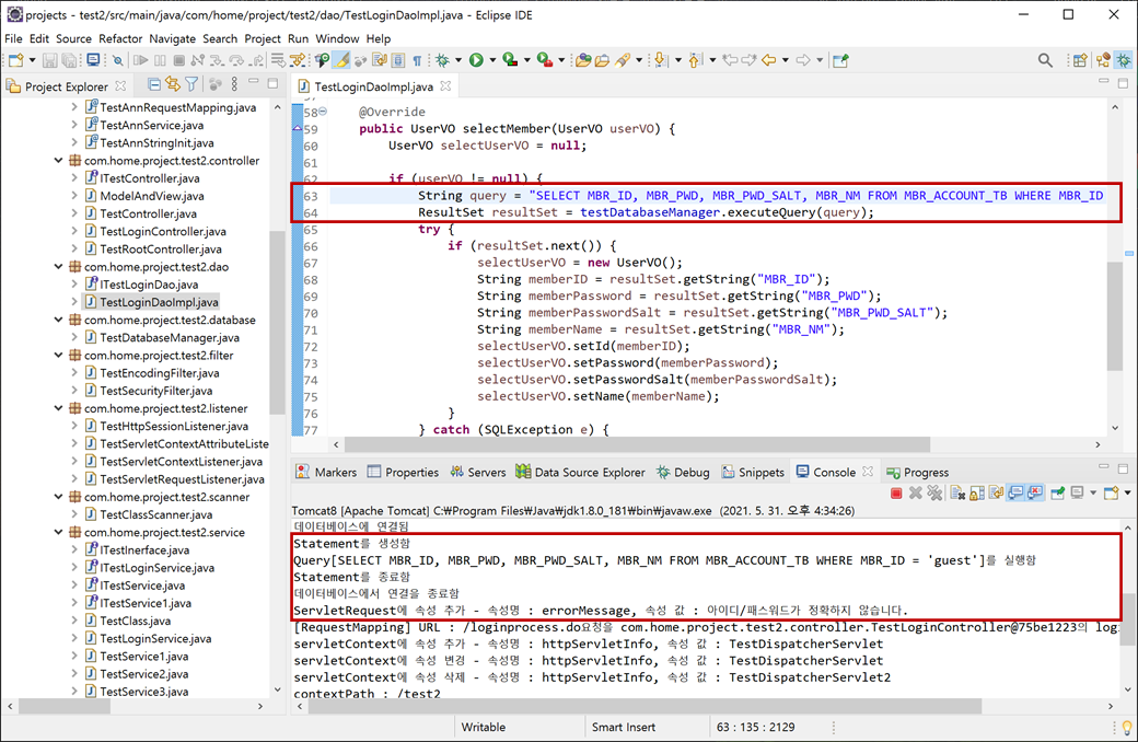 3. "TestLoginDaoImpl.java"의 "selectMember"메소드에서 쿼리문 실행 구문을 주석처리합니다.