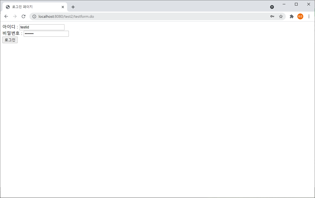 7. 다시 "Servers"탭에서 "tomcat8"를 선택하고 "start"버튼(start the server)을 클릭합니다. 웹 브라우저에서 "http://localhost:8080/test2/testform.do"를 입력합니다. 아이디에는 "testid"를 패스워드에는 "testpwd"를 입력하고 "로그인"버튼을 클릭합니다.