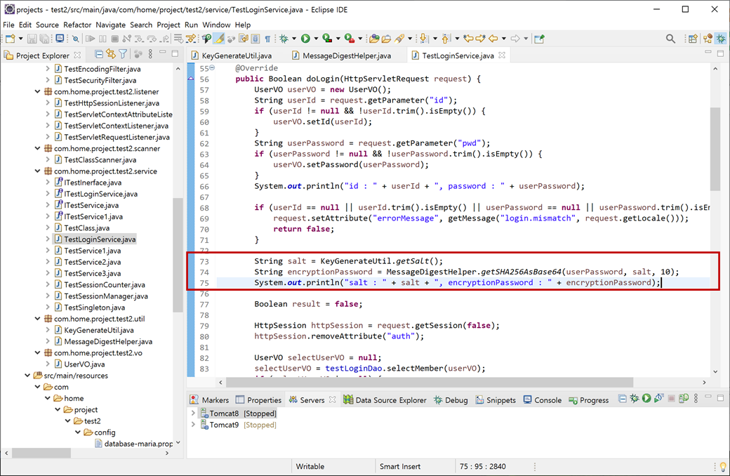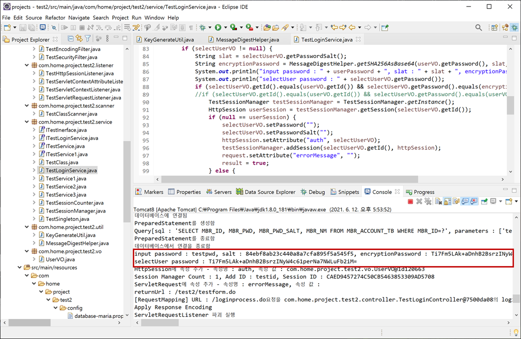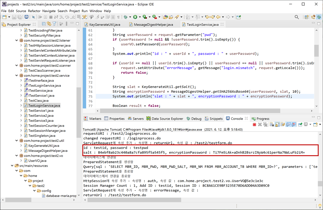 3. "TestLoginService.java"의 "doLogin"메소드에 사용자가 입력한 패스워드를 암호화 해시 알고리즘인 SHA-256과 Salt(솔트)를 이용해서 암호화합니다.
