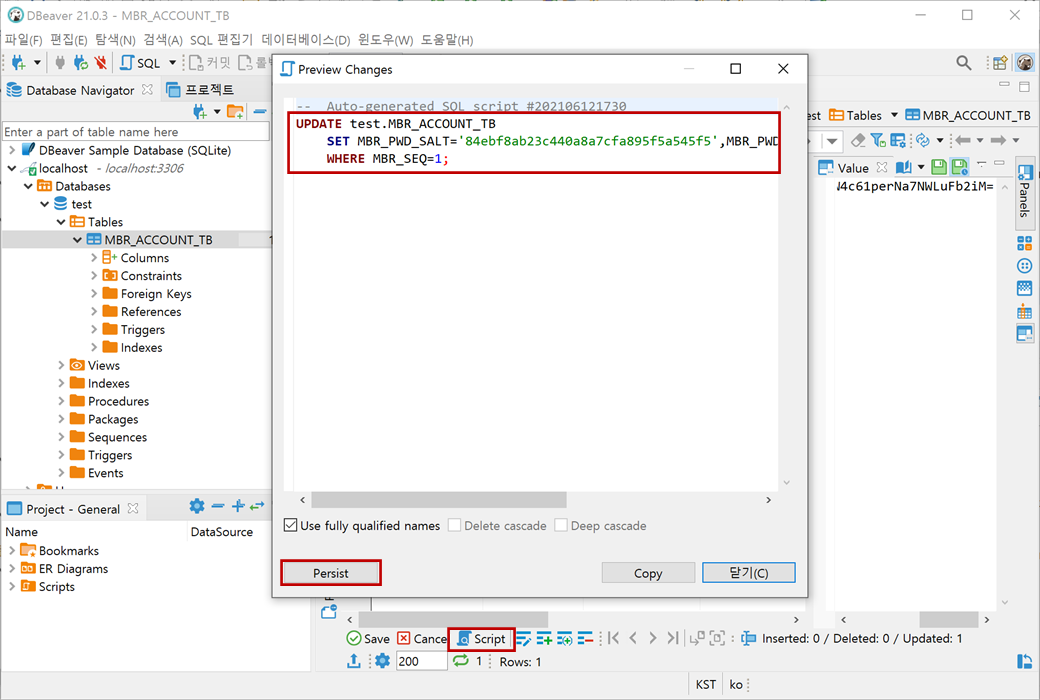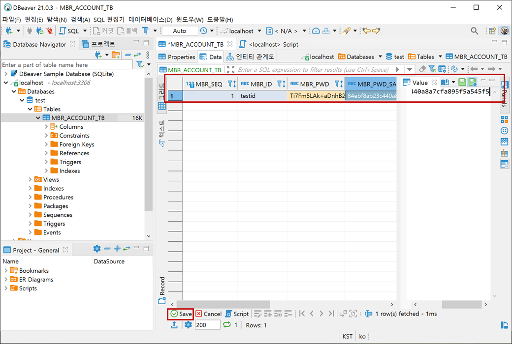 5. 디비버(DBeaver) 툴을 실행하여 사용자 로그인 테이블("MBR_ACCOUNT_TB")의 패스워드 필드("MBR_PWD")와 패스워드 솔트 필드("MBR_PWD_SALT")를 출력된 정보로 입력하고 "Save"버튼을 클릭하여 업데이트합니다.