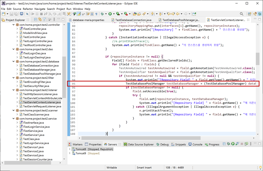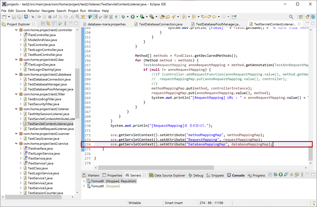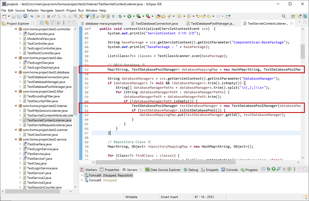 6. "test2" 프로젝트의 "Java Resources/src/main/java"에서 "com.home.project.test2.listener.TestServletContextListener"의 "contextInitialized()"메소드에 있는 "databaseMappingMap"의 인자를 "TestDatabaseManager"에서