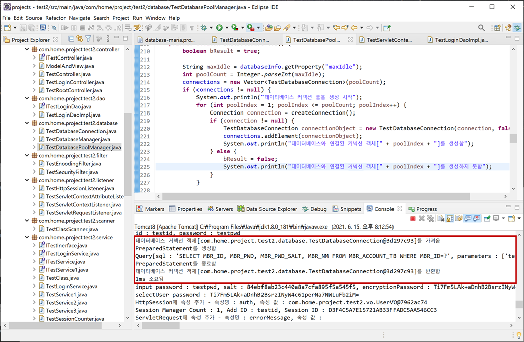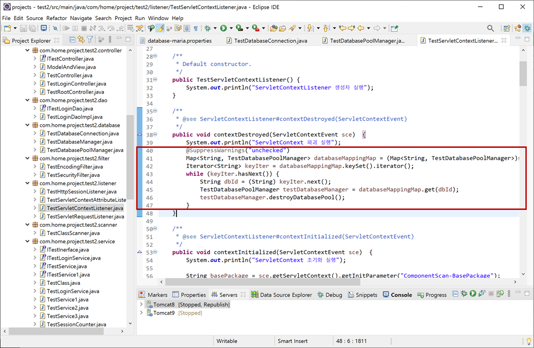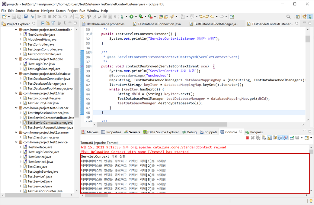 "test2" 프로젝트의 "Java Resources/src/main/java"에서 "com.home.project.test2.listener.TestServletContextListener"의 "contextDestroyed()"메소드에서 생성된 데이터베이스 커넥션 풀이 파괴되게 합니다.
