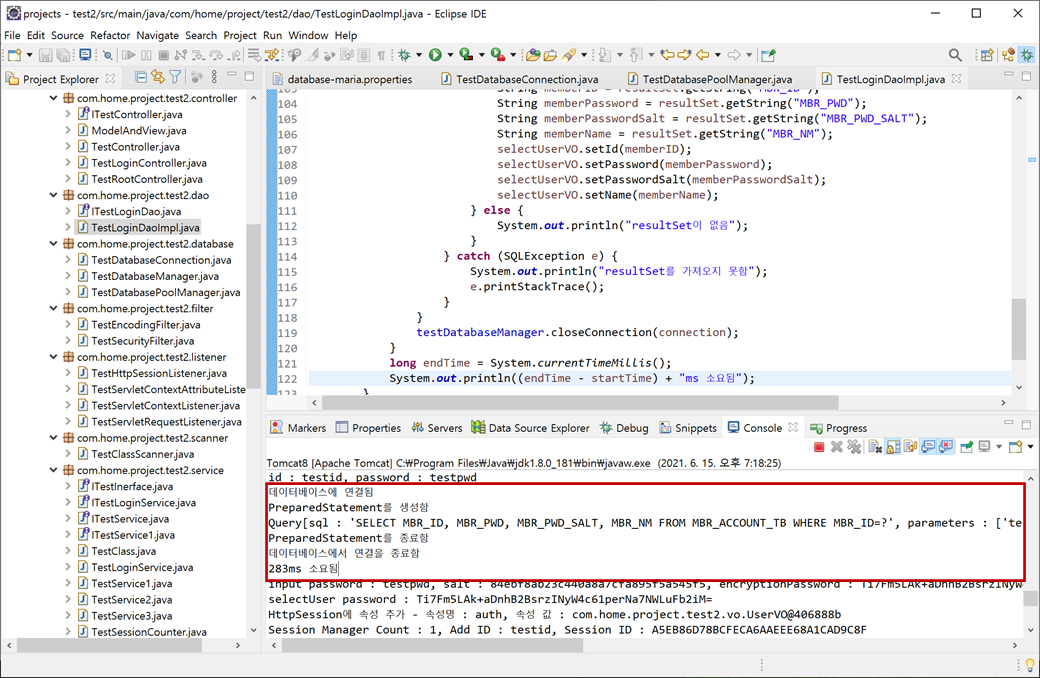 4. "test2" 프로젝트의 "Java Resources"에서 "src/main/java"의 "com.home.project.test2.dao.TestLoginDaoImpl.java"에 "selectMember()"메소드 함수에서 "testDatabaseManager.getConnection()"메소드 전과 "testDatabaseManager.closeConnection()"메소드 후에 추가합니다.