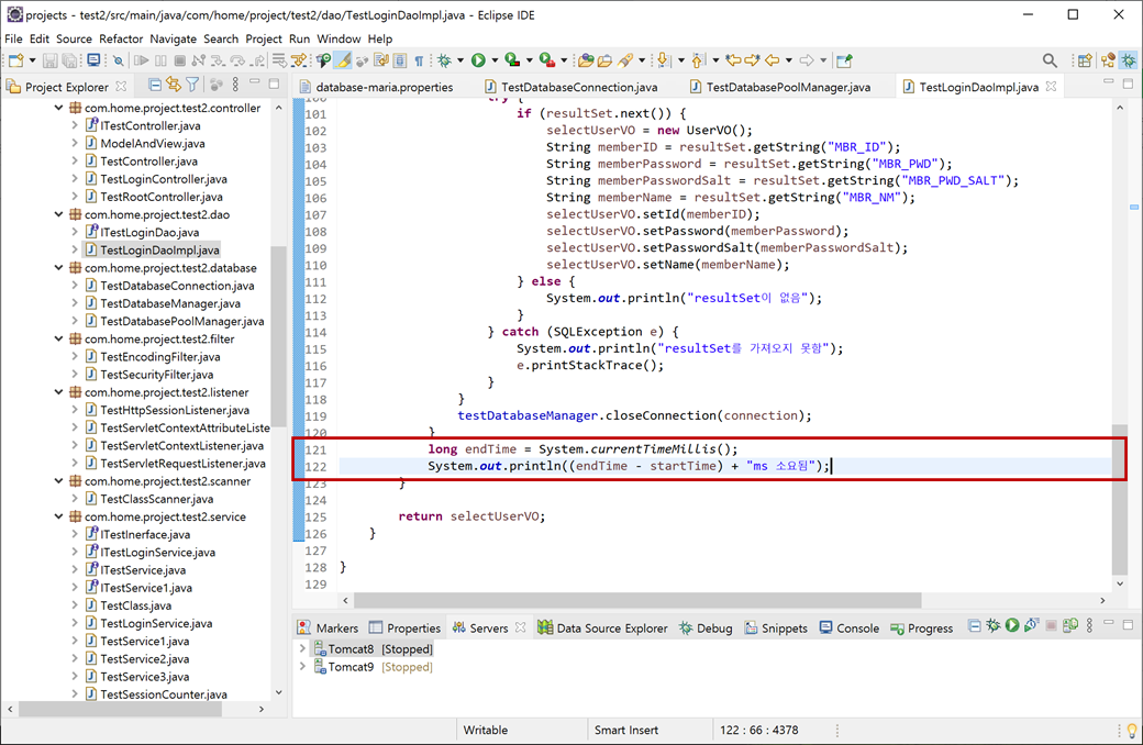 데이터베이스 커넥션 풀을 적용하기 전에 기존과의 성능 차이를 확인하기 위해 쿼리를 처리하는 메소드에서 데이터베이스 접속 전과 종료 후에 소요시간을 계산하여 출력되게 하겠습니다.
