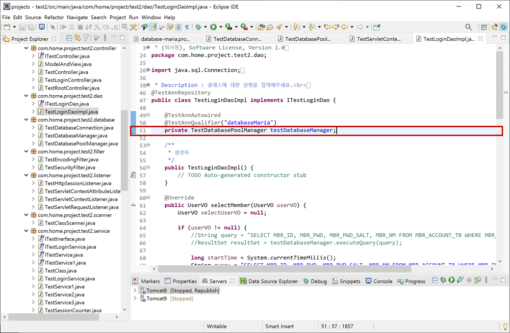 7. "test2" 프로젝트의 "Java Resources/src/main/java"에서 "com.home.project.test2.dao.TestLoginDaoImpl.java"의 멤버 필드 형을 "TestDatabaseManager"에서