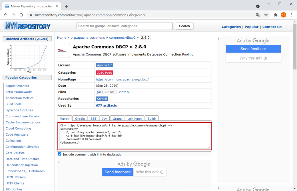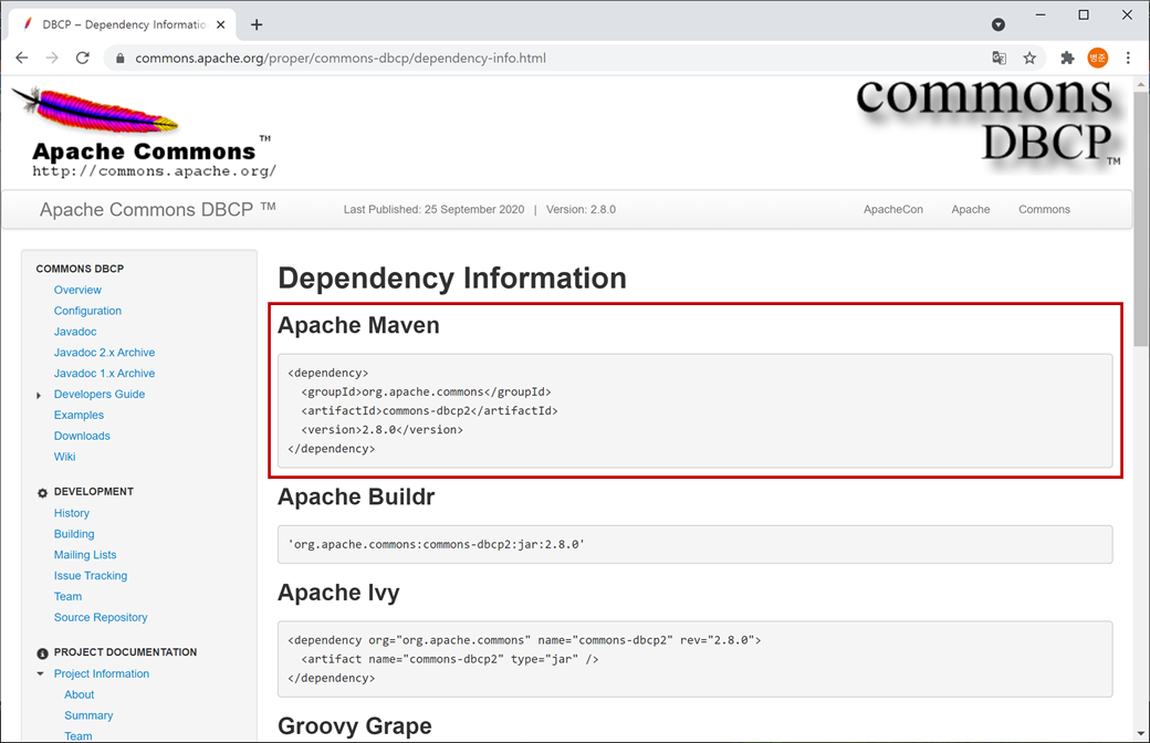 또는 아파치 사이트(https://commons.apache.org/proper/commons-dbcp/dependency-info.html)에서 "Maven" 스크립트를 복사합니다.