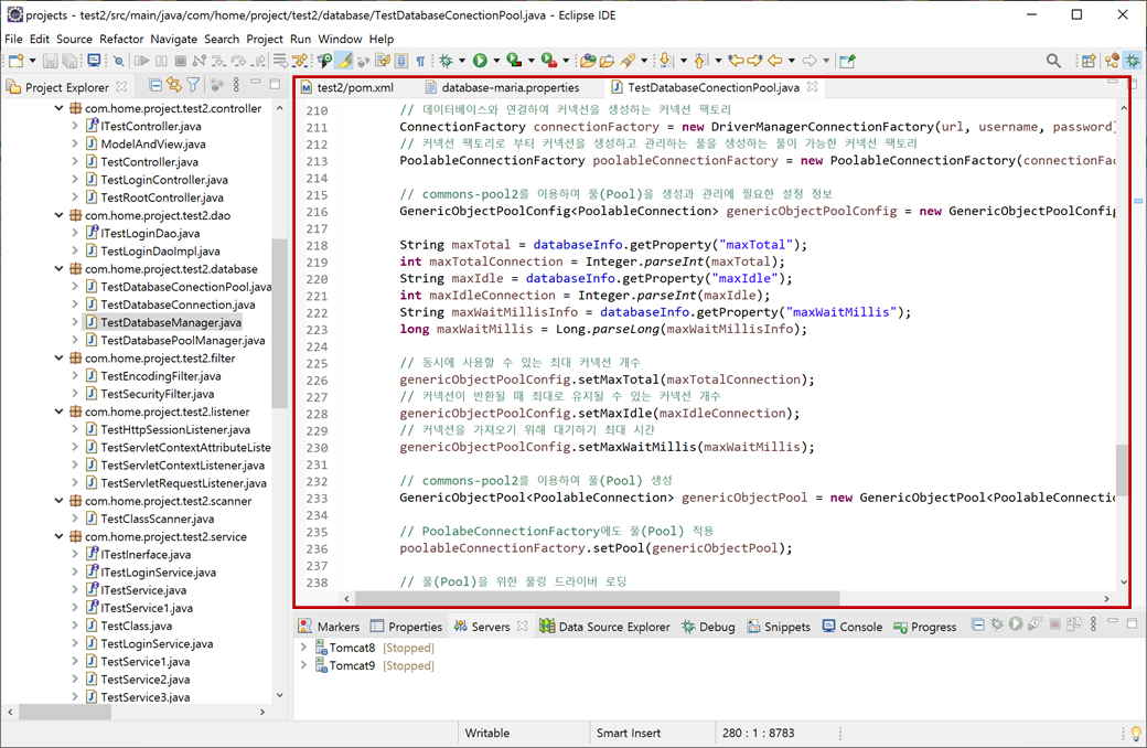 3. "test2" 프로젝트의 "Java Resources"에 "src/main/resources"에서 "/com/home/project/test2/config/database-maria.properties"파일에 수정합니다.