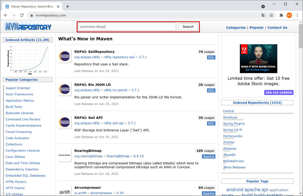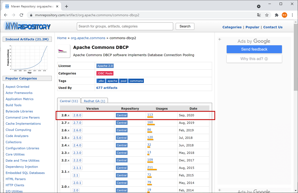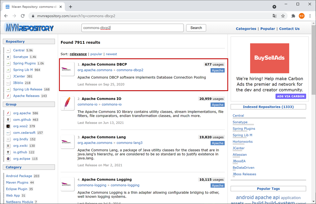 1. "https://mvnrepository.com"를 접속하고 검색에 "commons-dbcp2"를 입력하고 검색합니다.