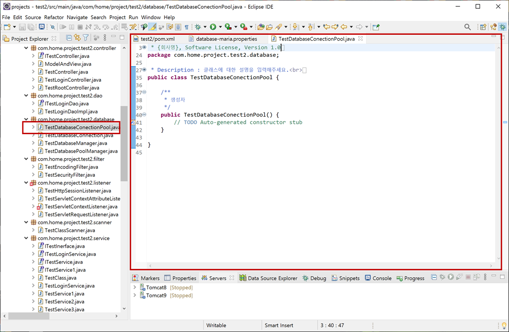 4. "test2" 프로젝트의 "Java Resources/src/main/java"에서 "com.hom.project.test2.database"에서 오른쪽 버튼을 클릭하여 컨텍스트 메뉴 [New > Class]를 클릭하고 "TestDatabaseConectionPool.java"를 생성합니다.