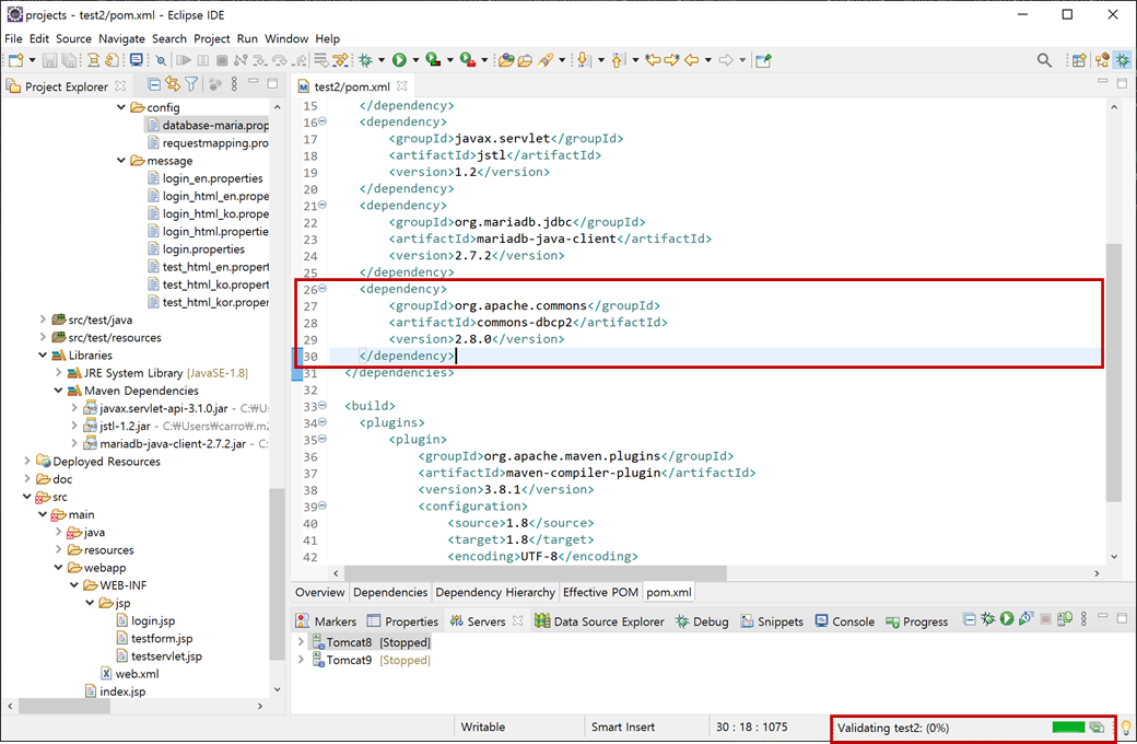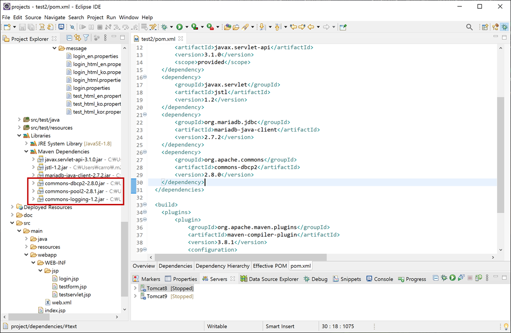 2. "test2" 프로젝트의 "pom.xml"을 오픈하여 붙여넣기하고 저장합니다. 그러면 Maven에서 "commons-dbcp2-2.8.0.jar", "commons-pool2-2.8.1.jar", "commons-logging-1.2.jar"파일들을 자동으로 다운로드 받습니다.