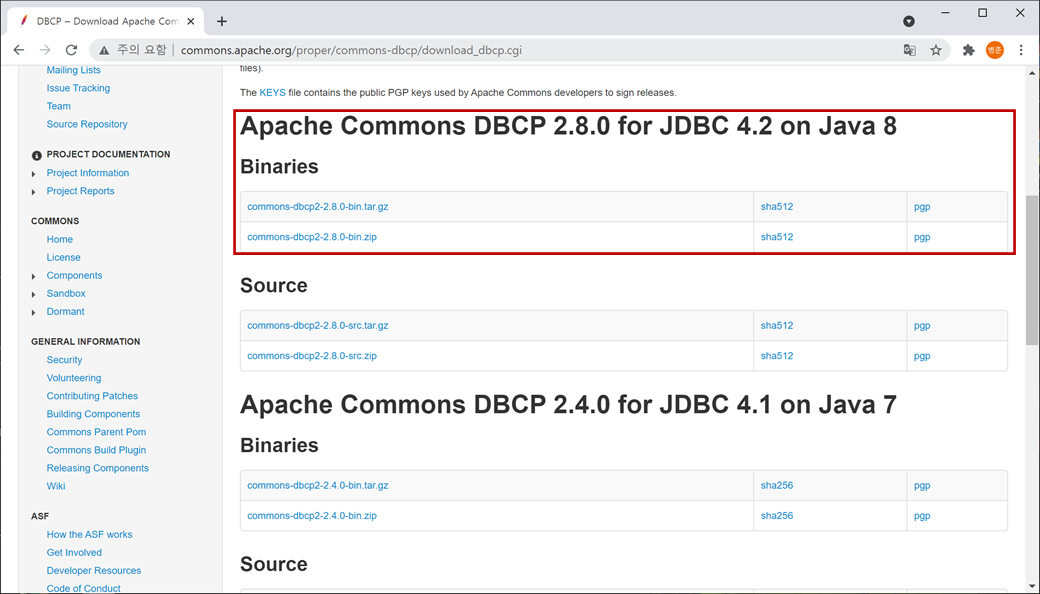 만약 Maven대신 Jar파일로 다운로드 받아서 사용하신다면 "http://commons.apache.org/proper/commons-dbcp/download_dbcp.cgi"에서 "Commons DBCP"의 버전별로 다운 받으시면 됩니다.