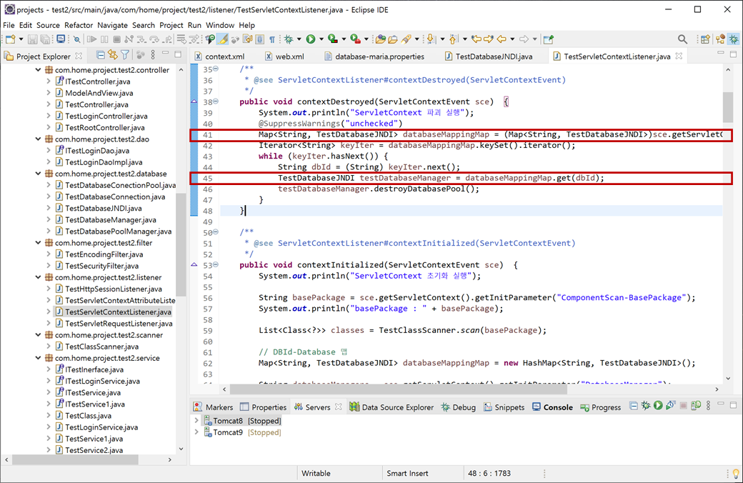 8. "test2" 프로젝트의 "Java Resources/src/main/java"에서 "com.home.project.test2.listener.TestServletContextListener"의 "contextInitialized()"메소드에 있는 "databaseMappingMap"의 인자를 "TestDatabaseConectionPool"에서