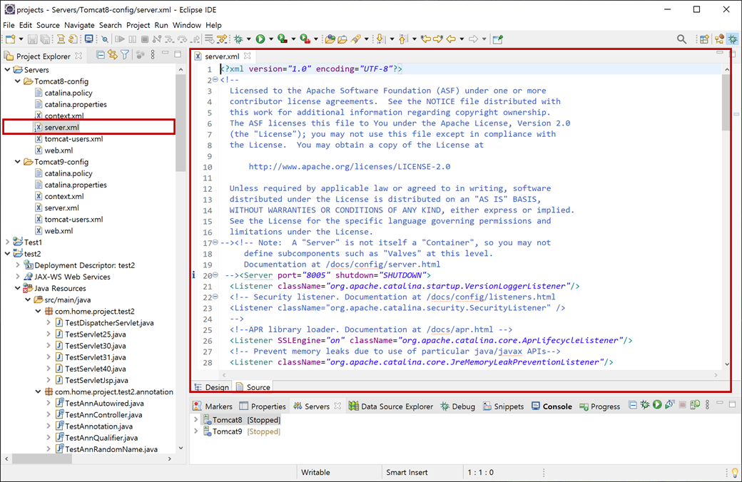 3. "Servers"에서 "Tomcat8-config"이나 "Tomcat9-config"의 "server.xml"를 오픈합니다.