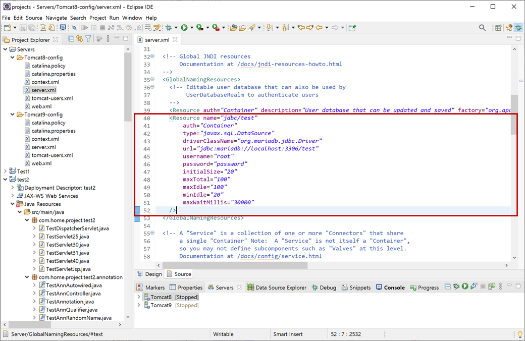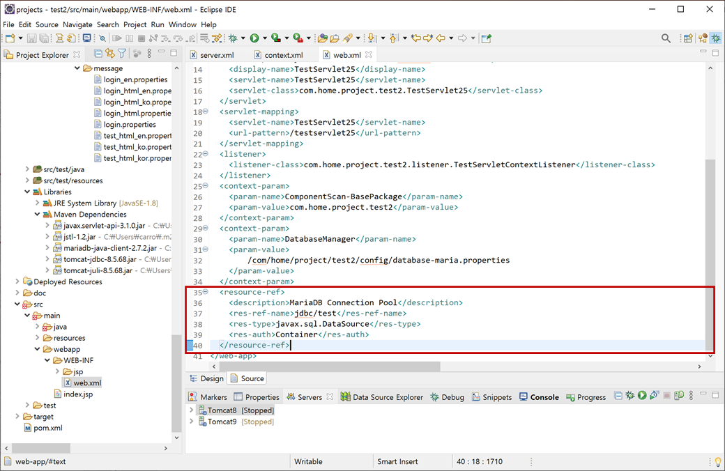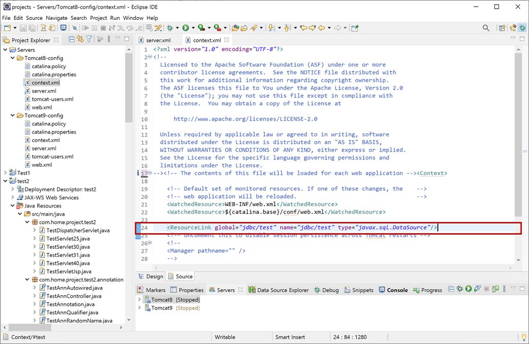 위에서 설명한 것처럼 "server.xml"파일의 "<GlobalNamingResources>"태그안에 "<Resource>"태그를 추가하고 "context.xml"파일에 "<ResourceLink>"태그를 추가하는 방법과 "context.xml"파일에 "<Resource>"태그를 추가하는 방법이 있습니다.