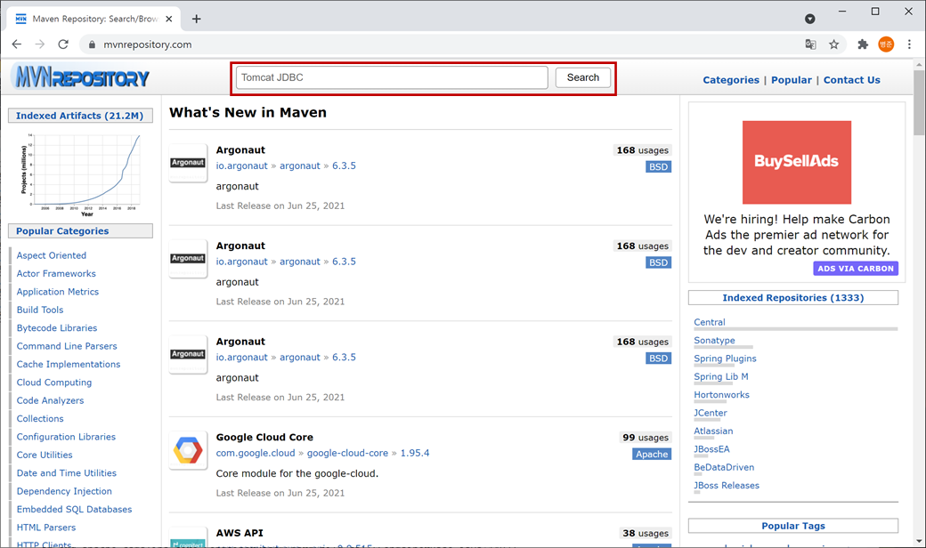 1. "https://mvnrepository.com"를 접속하고 검색에 "Tomcat JDBC"를 입력하고 검색합니다.