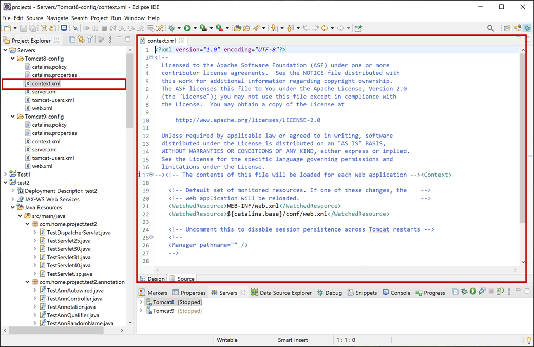 4. "Servers"에서 "Tomcat8-config"이나 "Tomcat9-config"의 "context.xml"를 오픈합니다.