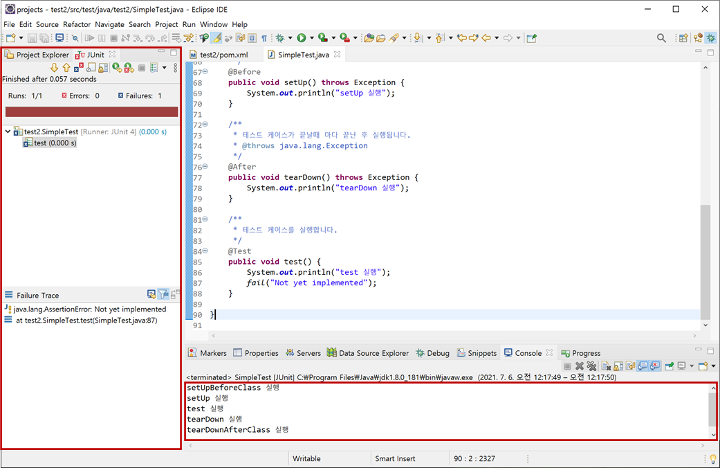 "SimpleTest"가 실행되면서 왼쪽에 "JUnit"이란 탭이 추가됩니다. 그런데 "Failures"이 "1"이 나오고 실패에 대한 위치가 하단에 나옵니다. 그 이유는 테스트 케이스에서 실패(fale) 매소드가 실행되었기 때문입니다.