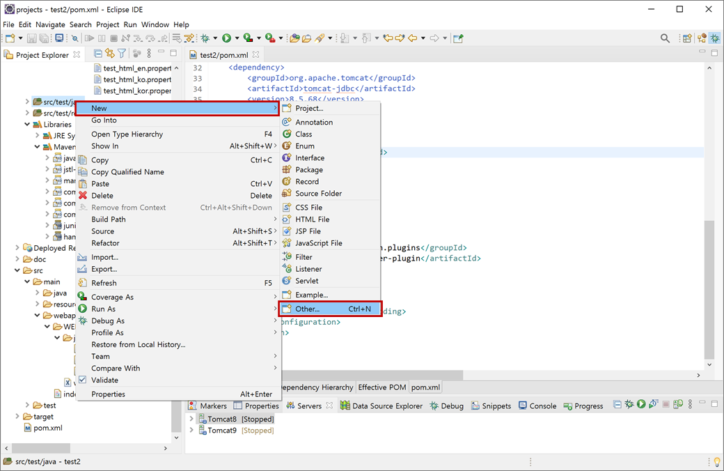 1. "test2" 프로젝트의 [Java Resources > src/test/java]에서 마우스 오른쪽 버튼을 클릭하여 콘텍스트 메뉴에서 [New > Other...]를 클릭합니다.
