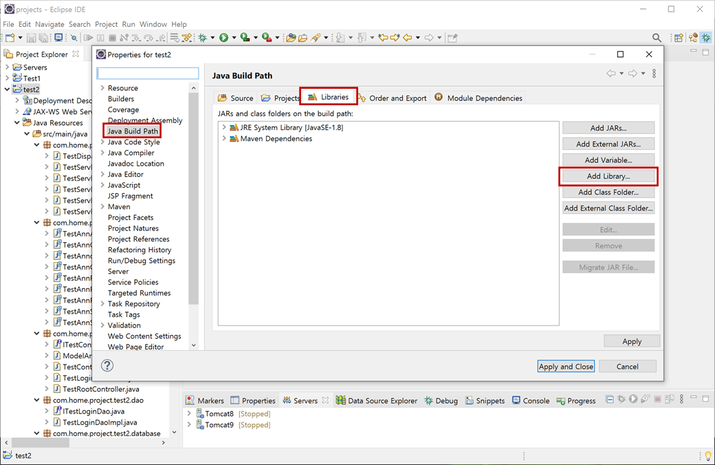 "Properties"창에서 "Java Build Path"를 클릭하고 "Libraries"탭을 클릭한 후, "Add Libray..."버튼을 클릭합니다.