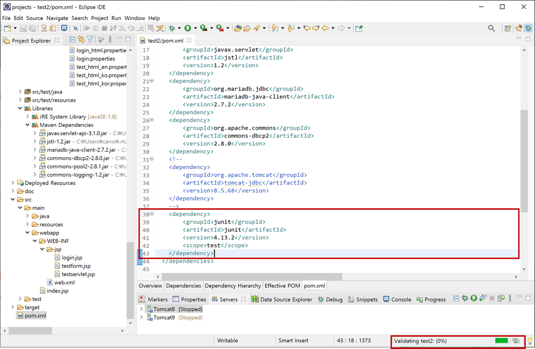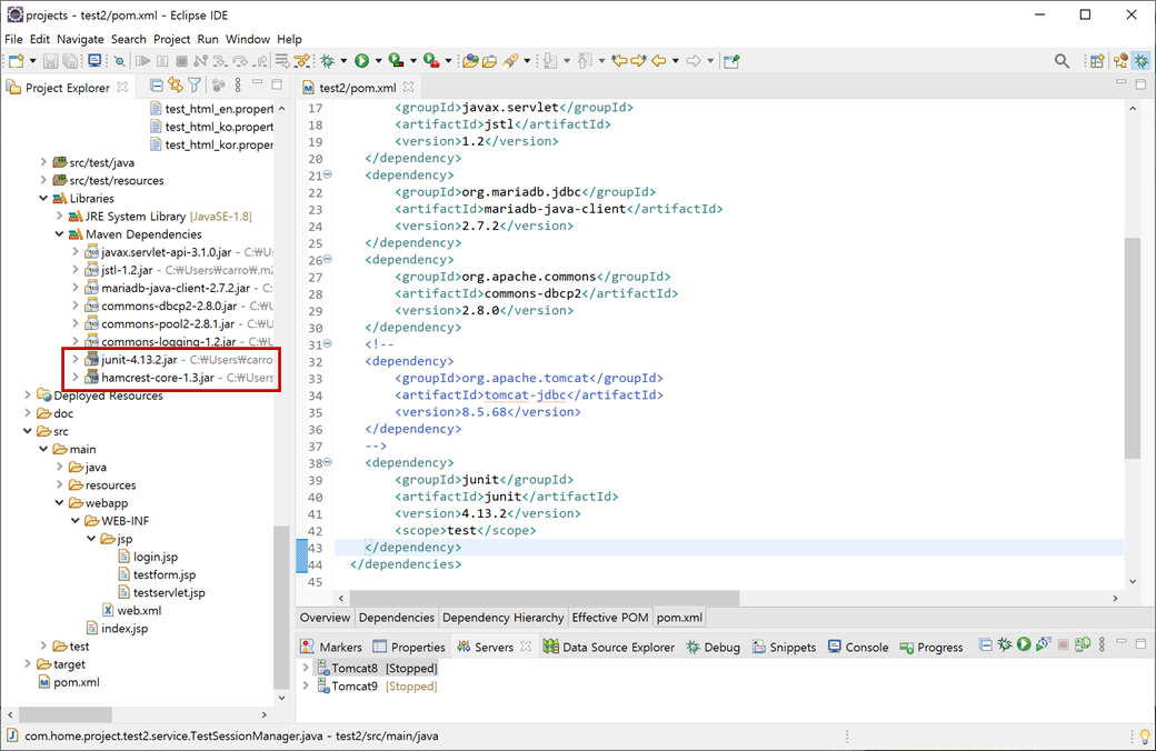2. "test2" 프로젝트의 "pom.xml"을 오픈하여 복사한 스크립트를 붙여 넣기 하고 저장합니다. 그러면 Maven에서 "junit-4.13.2.jar", "hamcrest-core-1.3.jar"파일들을 자동으로 다운로드합니다.