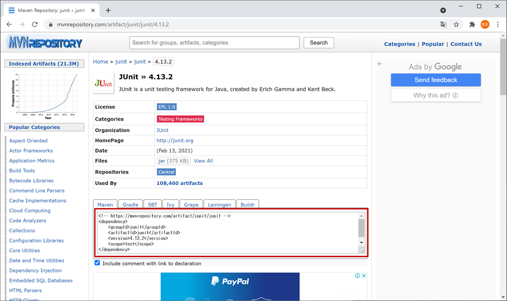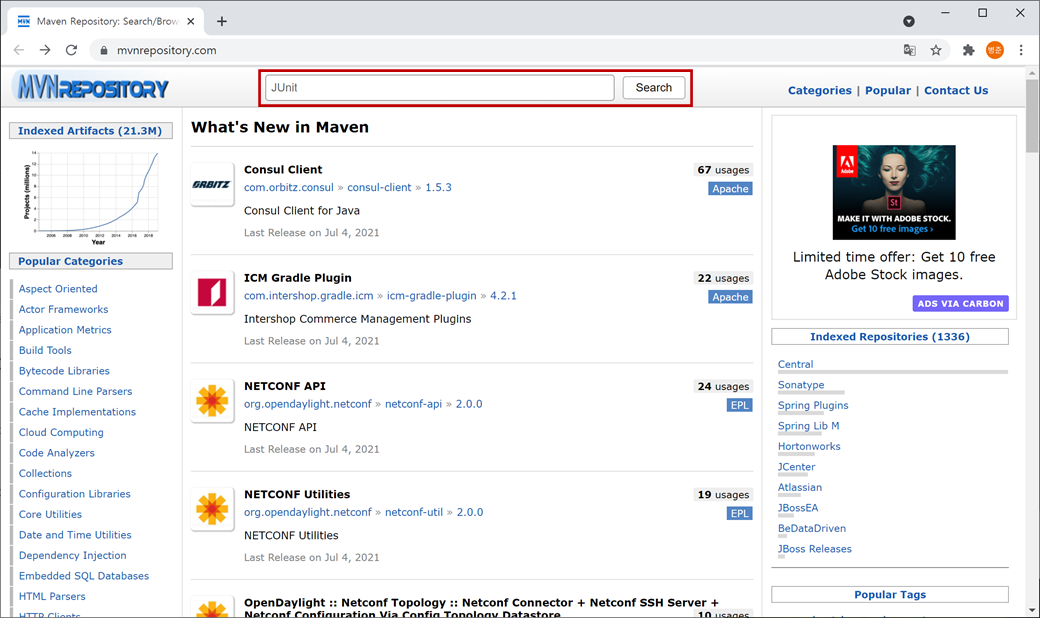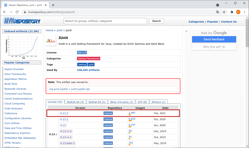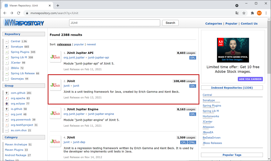 1. "https://mvnrepository.com"를 접속하고 검색에 "JUnit"를 입력하고 검색합니다.