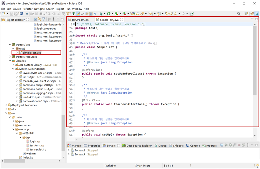 "test2" 프로젝트의 [Java Resources > src/test/java]에 "test2 > SimpleTest.java"가 생성됩니다.