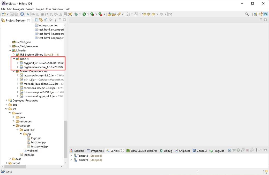 "test2" 프로젝트의 [Java Resources > Libraries]에 "JUnit 4"가 등록되고 이클립스 플러그인 폴더(C:\workspaces\eclipse\plugins)에 있는 "org.junit_4.13.0.v20200204-1500.jar", "org.hamcrest.core_1.3.0.v20180420-1519.jar"파일이 연결되어 있는 것을 확인할 수 있습니다.