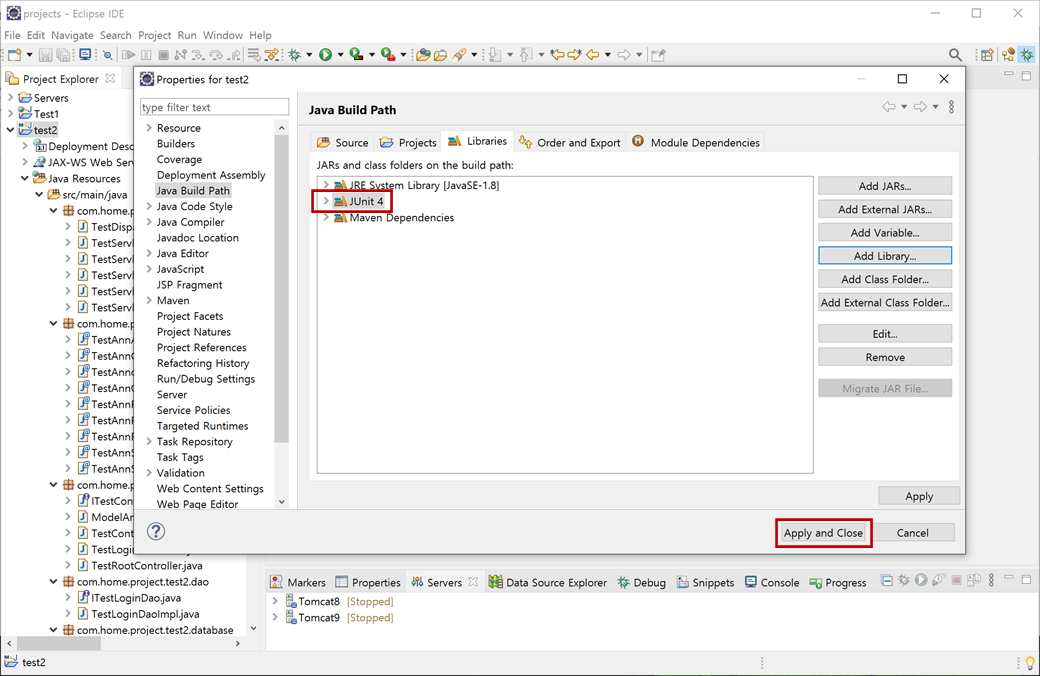 "Libraries"에 "JUnit"이 추가됩니다. "Apply and Close"버튼을 클릭합니다.
